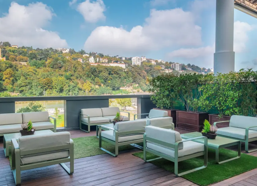 Nous sommes situés en bord de Saône. Notre terrasse offre une vue imprenable sur la Saône ainsi que sur la basilique de Fourvière.