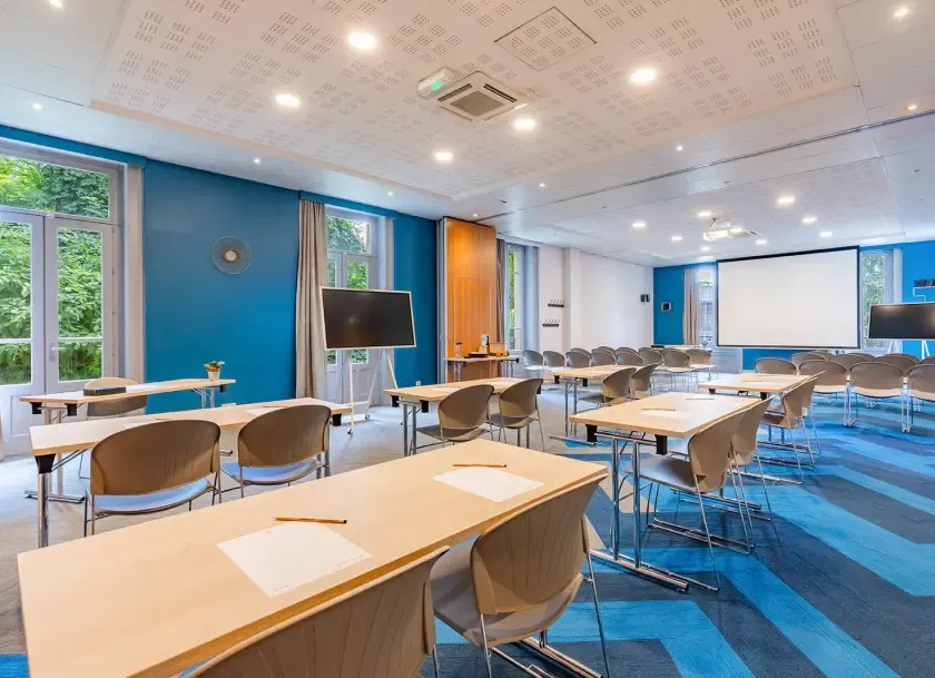 3 salles de séminaire à la lumière du jour : 50m², 60m² et 40m² (modulables en 1 salle de 100 m²). Notre équipe commerciale est à votre écoute pour vous aider à réaliser tous vos événements professionnels. Salons à la lumière du jour • Salons climatisés • Internet Wifi 100% fibre très haut débit • Vidéoprojecteur, écran • Sonorisation et micros (en supplément)