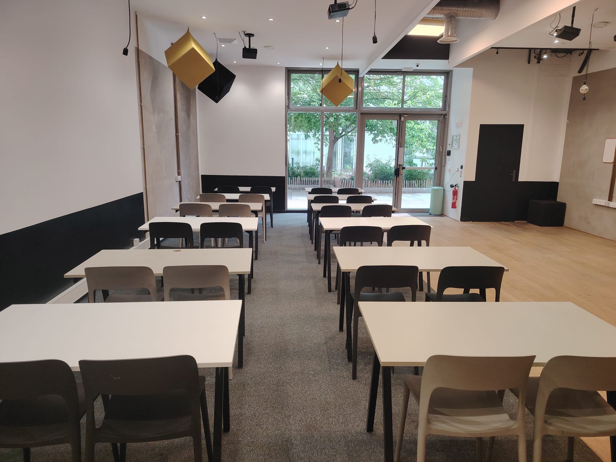 Le lieu est pensé pour accueillir des ateliers ou des événements professionnels. Un comptoir central façon café/bar, servant de point de rencontre informel De grandes tables communes favorisant le travail collaboratif et les échanges Des assises variées (tabourets, chaises, tables) pour s’adapter aux usages Un espace événementiel / réunion, équipé d’un écran de projection