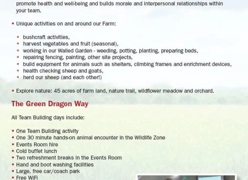 Nous sommes un lieu de réunion et de conférence situé dans le nord du Buckinghamshire, avec des vues panoramiques et une cuisine provenant de notre propre ferme et de nos vergers. Notre priorité absolue est de vous assurer le meilleur service possible et de vous offrir les installations nécessaires pour assurer le succès de votre événement et permettre à vos délégués de profiter au maximum de la journée. Notre lieu : Salle voûtée à colombages, lumineuse et aérée Vues magnifiques sur la campagne Nous accueillons des très petits groupes jusqu'à 80 délégués en configuration théâtre Gestion de compte sur mesure pour vous aider à planifier la journée parfaite Parking gratuit illimité Équipe dédiée sur place pour s'assurer que la journée se déroule exactement comme prévu Nos installations Entièrement équipées avec les dernières technologies et Wi-Fi gratuit Agencements optionnels de style salle de réunion, en groupes ou en configuration théâtre Écran LCD projeté et adapté de 3 mètres, lecteurs DVD et CD Système de sonorisation, microphone, rétroprojecteur et tableaux de conférence Stores occultants pour permettre l'obscurcissement de la salle pour les présentations Aliments issus de sources durables Aliments frais, de saison, préparés à partir de notre propre ferme Nos aliments sont produits de manière éthique et durable – et ont un goût fantastique ! Nous pouvons répondre aux exigences alimentaires particulières 2 pauses thé/café avec des gâteaux faits maison à déguster Nous proposons une foule d'activités de campagne et d'intérieur qui compléteront votre événement ou votre conférence. L'extérieur unique Nous avons une approche différente et rafraîchissante des événements d'équipe qui exploite les grands espaces et favorise la santé et le bien-être. Nos activités sont uniques et propices à la pensée créative et à la consolidation d'équipe. Toutes nos activités se déroulent dans et autour de notre ferme et varient en fonction des saisons. Elles sont toutes axées sur notre philosophie écologique, durable et de bien-être. Voici quelques exemples de nos activités : Activités de survie en milieu naturel Récolte de légumes et de fruits Rassemblement de moutons Contrôles de la santé des animaux Elles sont très amusantes et revigorantes, et favorisent certainement la consolidation d'équipe, car votre groupe découvre les grands espaces et la vie à la ferme. Laissez-nous créer l'activité d'équipe parfaite pour vous Nous serions ravis de développer une activité qui vous convient parfaitement – parlez-en à notre équipe et nous veillerons à ce que votre activité réponde aux objectifs de votre événement avec quelque chose de spécial qui fonctionnera le mieux pour votre équipe. Nous vous aiderons à planifier toute votre journée, parlez-en à notre équipe d'événements pour plus d'informations !