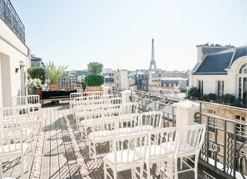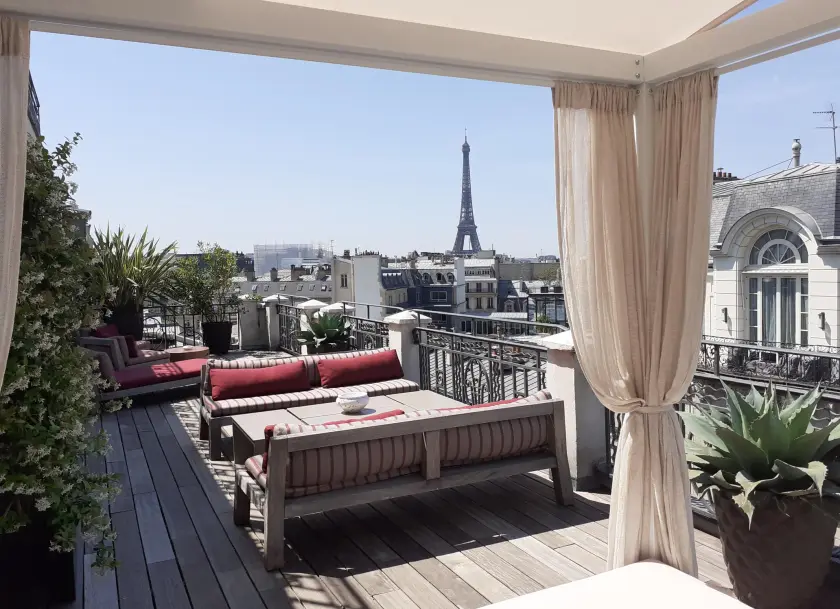 L'espace extérieur dont nous disposons est la terrasse, avec vue imprenable sur la Tour Eiffel, de notre Suite Marignan Eiffel. Cette terrasse est accessible par privatisation de la Suite uniquement et n'est pas couverte en cas de mauvais temps.