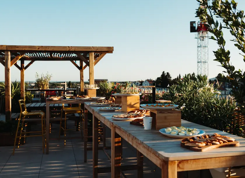 Notre grande terrasse sur le rooftop est l' endroit idéal pour créer des souvenirs inoubliables ! Que ce soit pour un déjeuner ensoleillé, un afterwork décontracté ou une soirée festive d’entreprise sous les étoiles, la terrasse est privatisable.