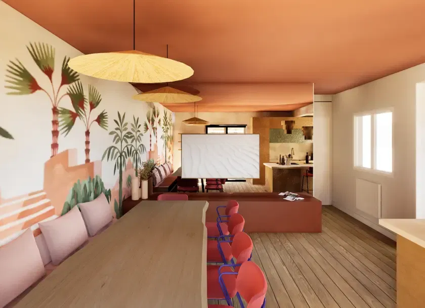 Idéale pour réunions, workshops ou comités de direction, cette maison lumineuse accueille jusqu’à 14 personnes dans un cadre calme et inspirant. Équipée d’un rétroprojecteur, écran, wifi haut débit, paperboard et cuisine pour pauses-café ou déjeuner, elle offre également un jardin aménagé pour échanges informels et moments de détente.